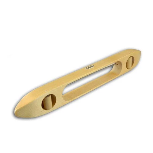 This Glimakra Swedish Boat Shuttle # 15 has an open bottom and has rollers for weaving fine threads on wide warps. It is 15 inches long and holds a 6 inch quill.