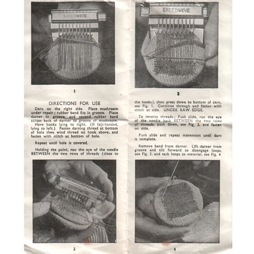 The original Speedweaver or Speedweve, was produced in England by E & A Chesstok in the 1940s and 1950s. The original concept was to provide a simple and easy tool to mend clothing during WWII on the homefront.